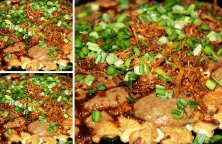 Letakkan tahu telur di atas piring saji, beri toge di atasnya kemudian sirami dengan bumbu kacang. Taburi dengan daun seledri dan beri kecap manis lalu sajikan dengan kerupuk emping.